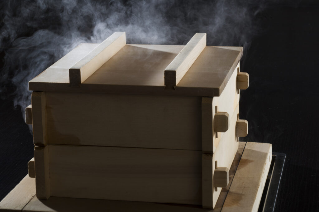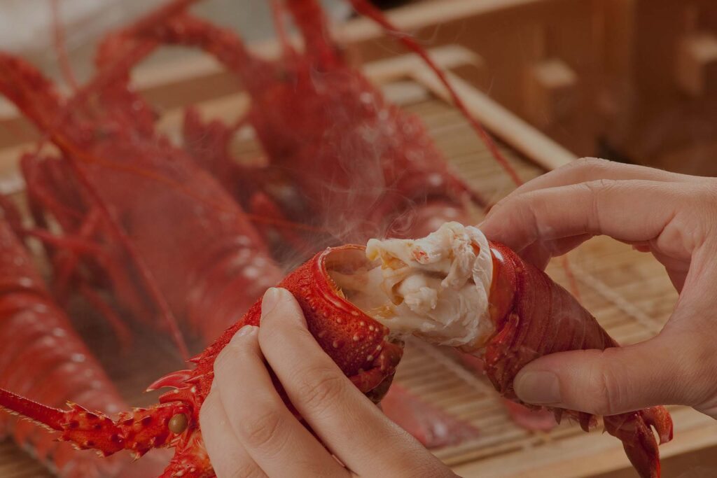そして、華月が活き伊勢海老にこだわる最大の理由……それは圧倒的な美味しさにあります。冷凍や途中で身を切り分けた伊勢海老と比べて、活きたまま丸ごと木曽檜の蒸籠で蒸し上げることで、旨味と水分が内部に閉じ込められます。余分な水分だけが適度に抜け、濃厚で甘みのある味わいが引き出されます。