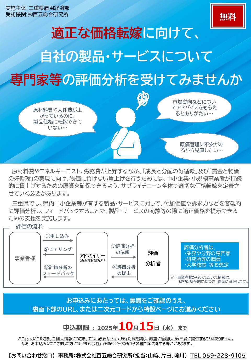 ホームページより申込書をダウンロードし、事務局(百五総合研究所)へ提出してください。https://www.hri105.co.jp/consulting/private_kakakutenka.html